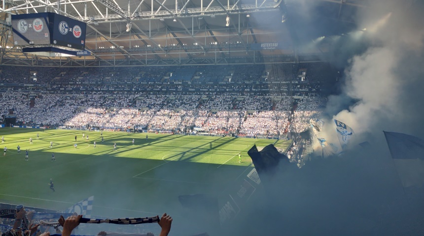 Bild von etlichen Rauchtöpfen in der Nordkurve untermalt.