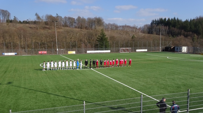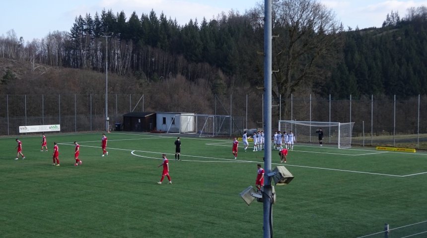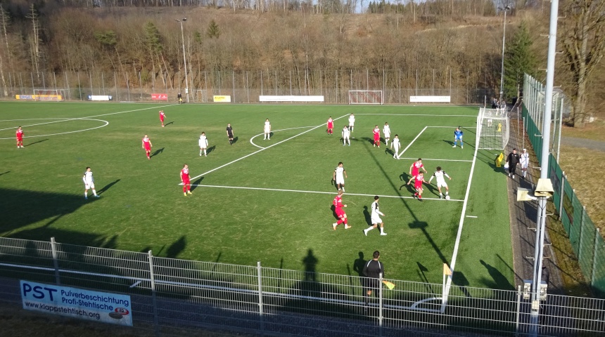 Ausgerechnet in dieser aussichtslosen und wenig erfreulichen Zeit, gastierte mit Rot-Weiss Walldorf ein Spitzenteam der Hessenliga im mittelhessischen Lahn-Dill-Kreis. Im engen Rennen um die Pole-Position mischen die Kicker aus der Flughafen-Gemeinde Mörfelden-Walldorf kräftig mit und gingen an diesem kalten, aber sonnigen Sonntagnachmittag als haushoher Favorit ins Rennen. Die Anreise mit dem Mannschaftsbus des Drittligisten Wehen Wiesbaden schien die eigenen Ansprüche zu untermauern. Das mächtige Gefährt thronte unübersehbar über einer Ecke des Spielfeldes. Der Steinbacher Sportplatz liegt in einer hügeligen bis bergigen Gegend, die der Jahreszeit entsprechend, jedoch noch recht karg aussah. Die nur knapp 100 Zuschauer versammelten sich außerhalb des tiefergelegenen Kunstrasenplatzes auf Höhe des Vereinsheimes und eines kleinen überdachten Bereichs im Stile einer Carport-Konstruktion. Der Ground lebte eindeutig vom Panorama und nicht von seiner Ausstattung und Infrastruktur. Positiv zu erwähnen sind der lockere Einlass, der den Eintrittspreis hemdsärmelig abrundete und das spartanische, aber leckere Catering, bei dem vor allem die krossen Pommes überzeugen konnten.