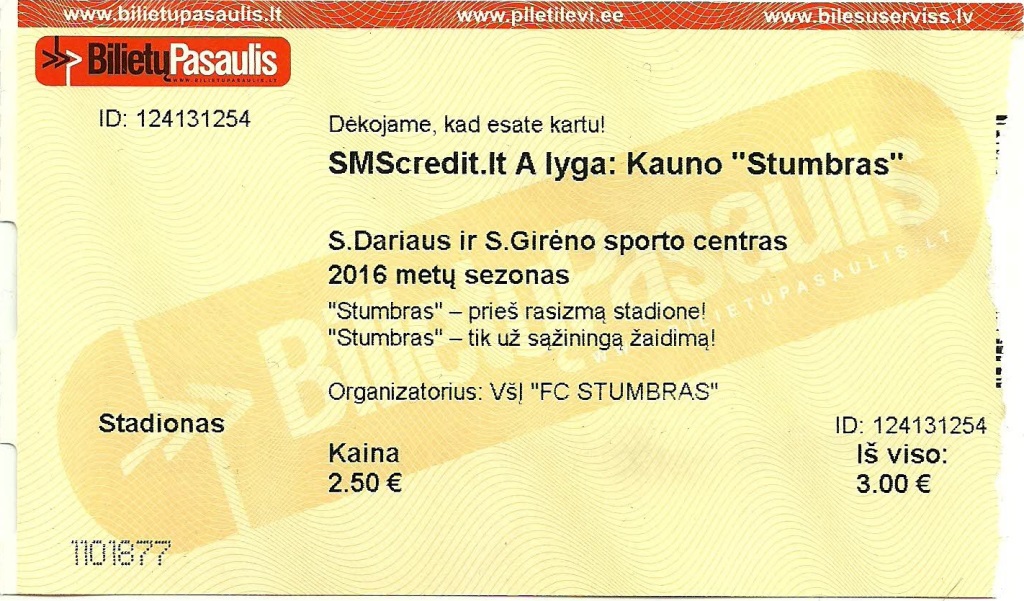 Rathausplatz an. Unser Ziel war das S.Dariaus-und-S.Gireno-Stadion, das einzige größere Stadion in Litauen. Da dieses auf einem Hügel liegt, kämpften wir uns aus der schönen Innenstadt durch grüne Parks nach oben, ehe wir die markanten Flutlichtmasten und die verwitterten Tribünen endlich erspähten. „Groß“ heißt eben nicht gleich „modern“ und groß ist sowieso relativ. Mit knapp 10.000 Plätzen ist der Ground für deutsche Verhältnisse höchstens drittklassig. Internationale Klasse hatte wiederum der Ticketverkauf. Nach der bereits lustigen Erfahrung des Ticket-aus-dem-Auto-kaufen im Vorjahr in Vilnius stellte sich auch hier ein Auto vor dem Eingang als rollendes Kassenhäuschen heraus. Mit je 2,50 Euro Einsatz hatten wir unsere Tickets und betraten das Stadion. Kurz zusammengefasst: Laufbahn, die erwähnten Flutlichtmasten, ausgebaute Haupttribüne und Kurven, keine Gegengerade, dafür eine Anzeigetafel, kein Dach (wir sind ja schließlich in Sunny Litauen) und ganz wichtig: teils prächtige Tropfsteine unter den Tribünen. Vor dem Spielbeginn gab es eine mir unbekannte